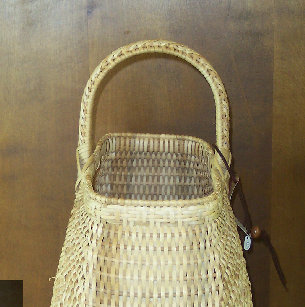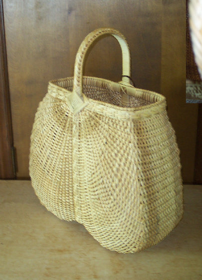 Basket measures: 9-1/2" handle width 18" long 22" handle height Woven with natural reed Braided handle Laced and arrow twill rim |